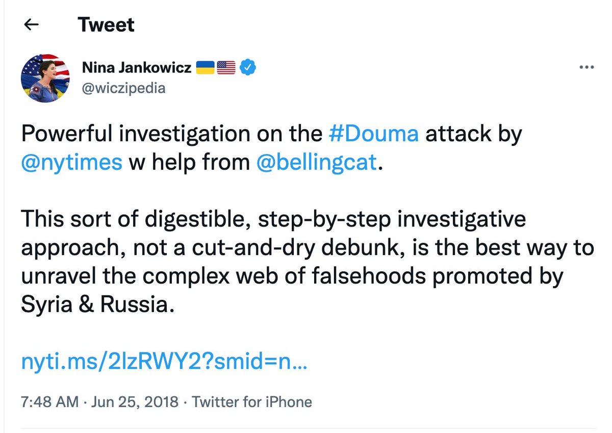 Here's Biden's new "Disinformation" czar promoting state-funded disinformation: NYT & NED-funded Bellingcat accusing Syria of committing a chemical attack in Douma.