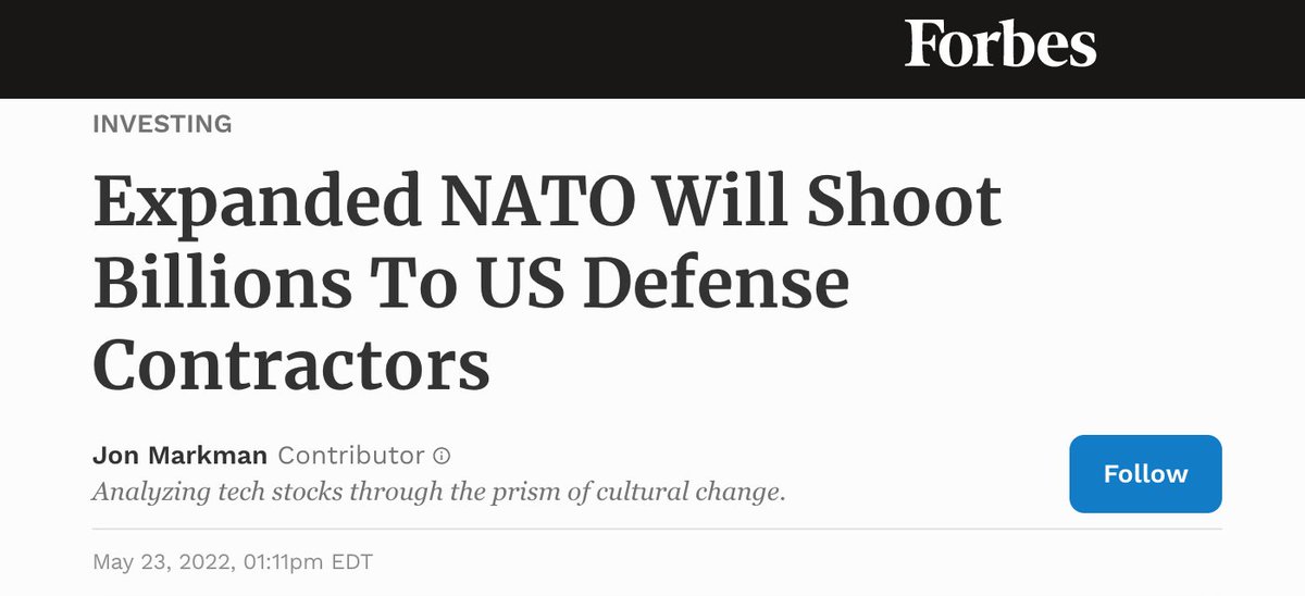 Exciting new development in the struggle to defend democracy from autocracy: according to Forbes, an "Expanded NATO Will Shoot Billions To US Defense Contractors." #SlavaRaytheon forbes.com/sites/jonmarkm…