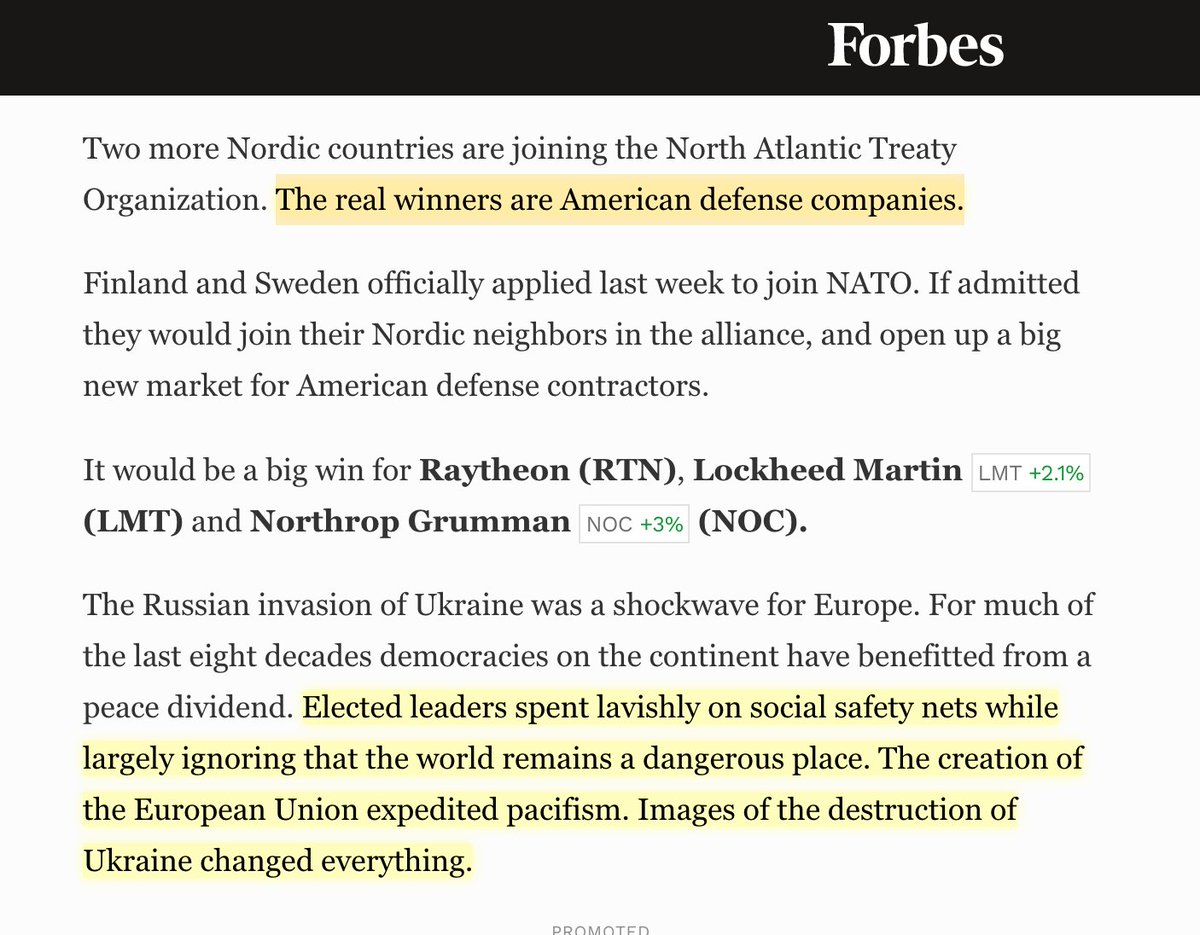 Forbes columnist: with NATO expansion, "the real winners are American defense companies."