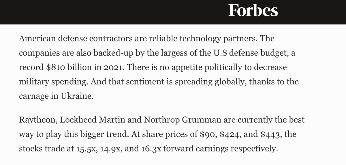 Arms makers are "backed-up by the largess of the US defense budget" i.e. US taxpayers. As an added bonus, "there is no appetite politically to decrease military spending," a sentiment "spreading globally, thanks to the carnage in Ukraine."