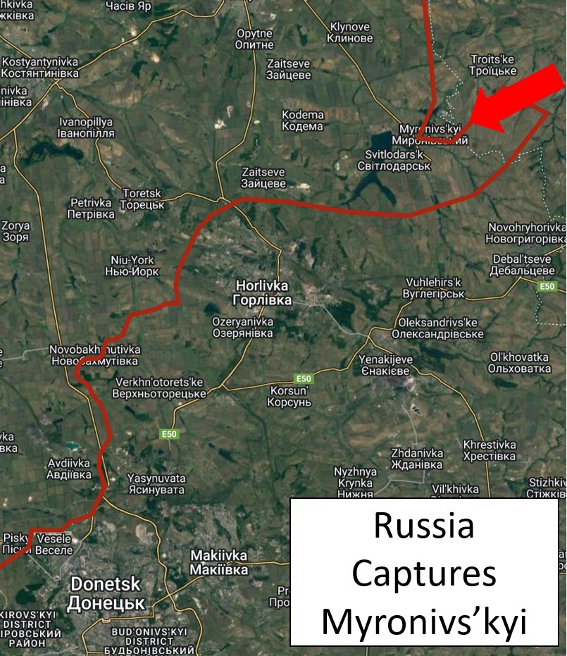 #Popasna Axis - Earlier today #Russian forces continued their advance S of #Popasna and captured the city of Myronivskyi, #Donetsk Oblast. Photos of #RUAF in front of a government building in the city confirmed it. This represents a one day 6mi/10km shift in the frontlines.