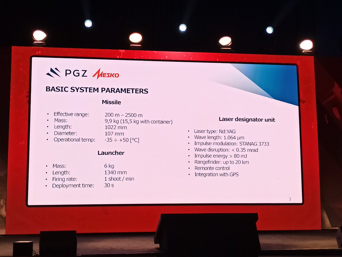 Kowalczuk: Pocisk może dokonywać ataku idąc po płaskiej trajektorii, albo działać w trybie ataku na cel z górnej półsfery, na odległościach do 2,5 kilometra i jest naprowadzany półaktywnie laserowo. #Defence24Day @PGZ_MESKO_SA