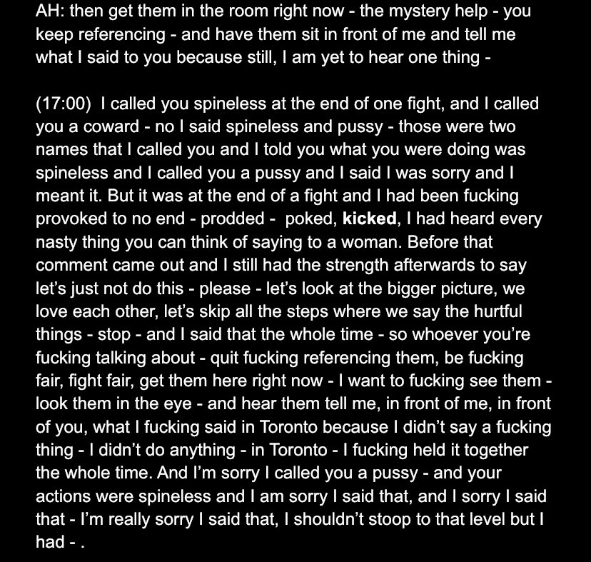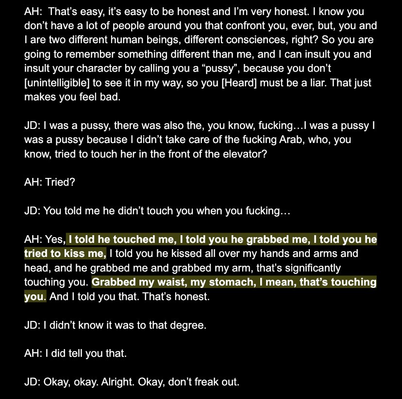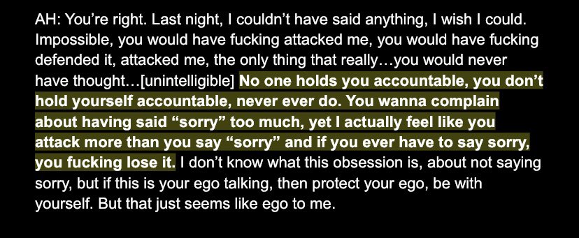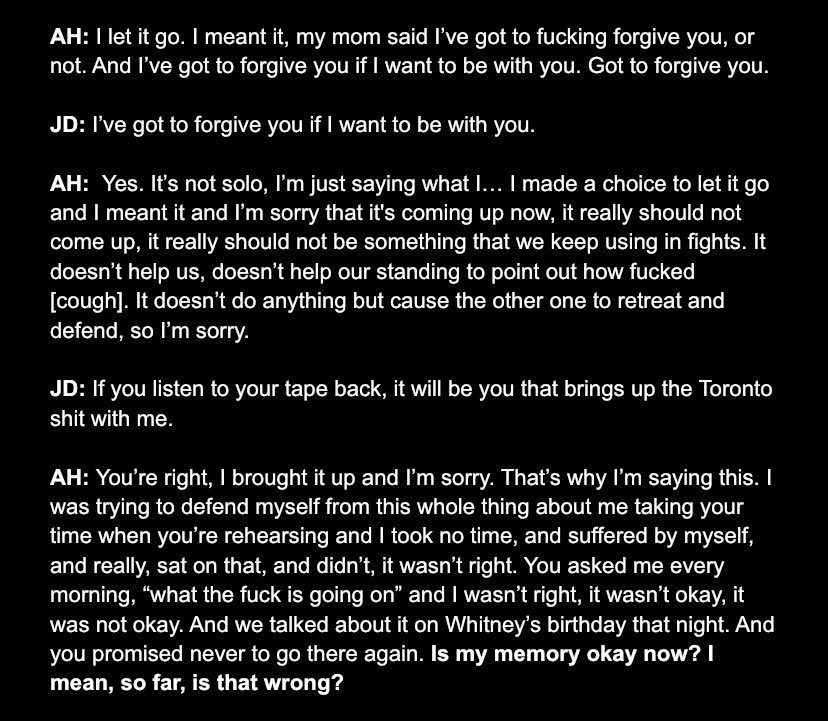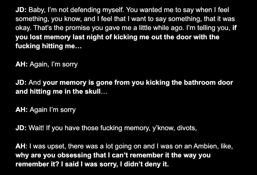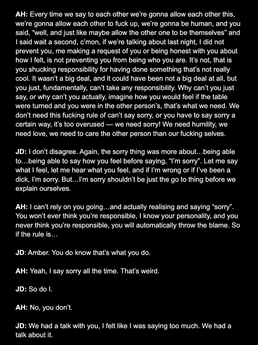 1h30m - overall convo on tape is about if “sorry” should be said before or after explaining - if at all. AH is resistant to JD’s insisting on explanation because it seems that explanations always end with JD shifting blame to her - & she just wants him to think about her feelings