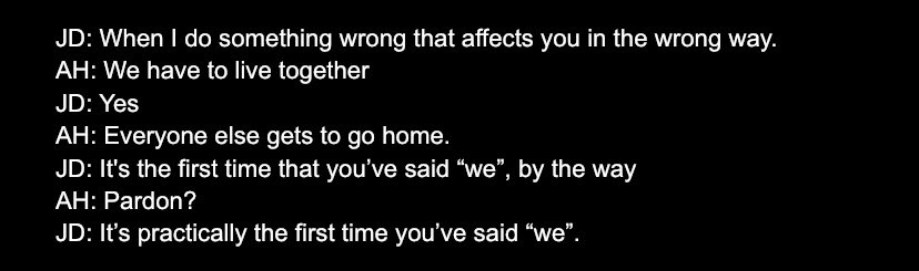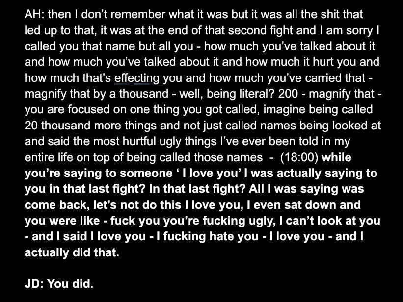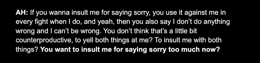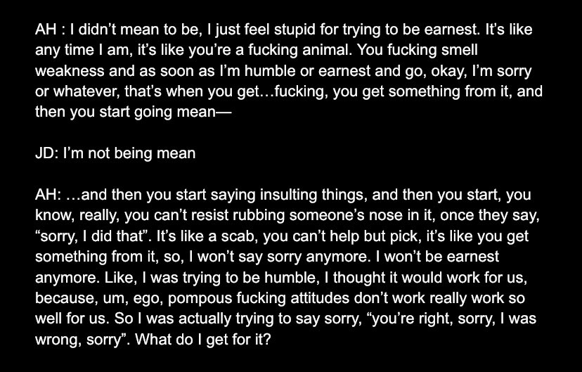 Around 47:30/48 AH apologises for getting defensive/flustered & notes that she was that way bc JD becomes meaner/vindictive WHEN she apologises. Like he gets off on her weakness. Abuse is about power & if he is meaner when she apologises — he is getting off on his own power