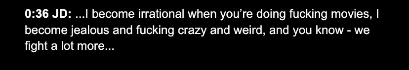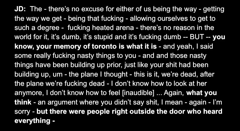 I think at this point in their relationship, JD was still actively trying to fix things, but there's still a lot of gaslighting, evidence of a clear imbalance of power and abuse when they start talking about the fights they had in Toronto - which start @ the 13m mark -
