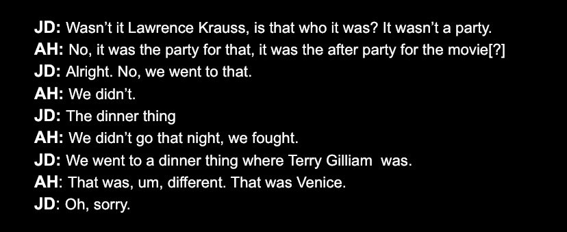 It’s interesting that Depp complains about Amber’s memory of the fights not being accurate considering at about the 21:30 mark he literally can’t remember what city certain events took place in: