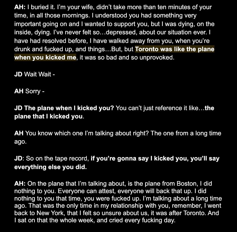 23 minute mark of exhibit 343 - AH brings up that Depp kicked her. He doesn’t deny it — saying instead that if they record what HE DID they have to record what she did too: which sounds like him admitting it happened to me.
