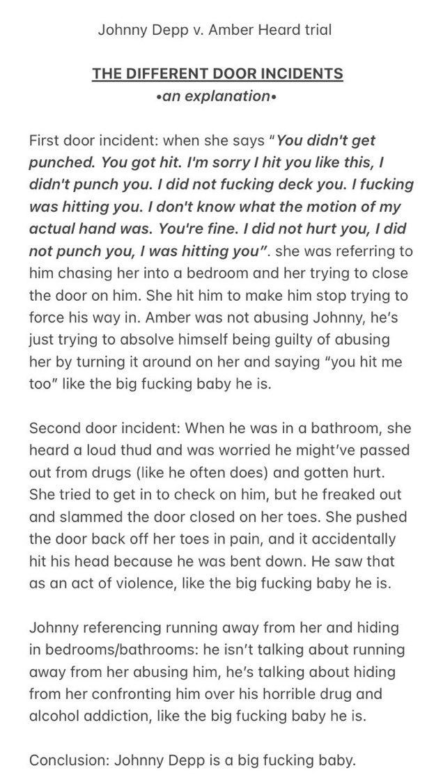 At the 16/18 m mark, Depp tells Heard her memory of the fights is wrong, that he has witnesses he can’t produce who heard it all (gaslighting) - she admits to calling him 2 mean things but then talks about how she sat there & told him she loved him while he screamed - he agreed.
