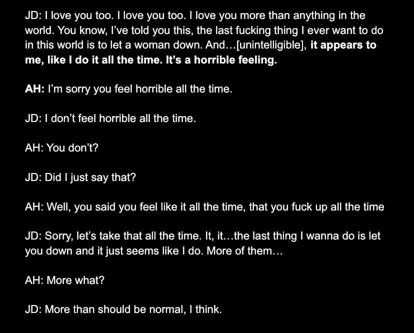 1h22m They affirm their love for each other several times throughout the tape. Here, Depp seems like he’s leaning closer to taking responsibility but he can’t quite get there. It’s not “I let you down” it’s “it appears like” & he’s still defensive — he just can’t take the L