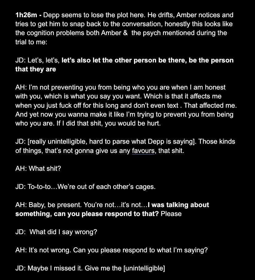 1h26m - Depp seems to lose the plot here. He drifts, Amber notices & tries to get him to snap back to the conversation, honestly this looks like the cognition problems both Amber & the psych mentioned during the trial to me: