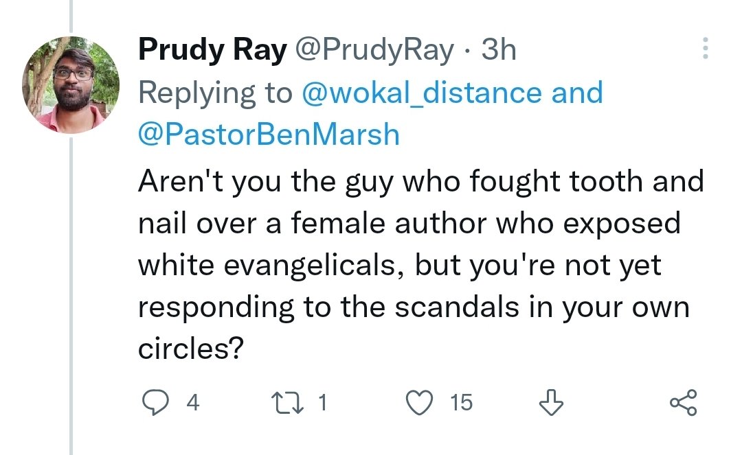 My response to Du mez (that's the woman he said I fought totoh and nail) had nothing to do with the SBC. I disagreed with her over methods and conclusions, not abuse in the SBC.