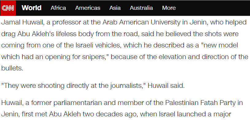 Huweil, who didn't see any of Israel's soldiers take aim at Shireen, seems to be the basis of @CNN's key claim of "targeting".