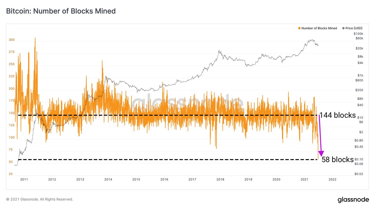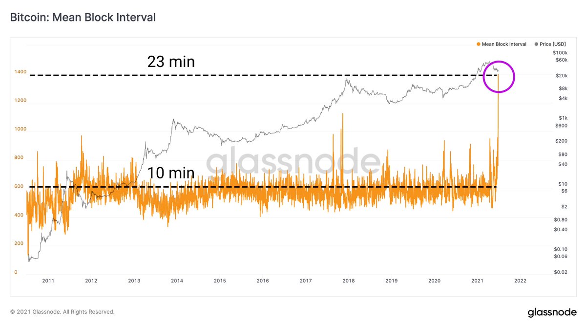 1/ Yesterday, it took on average 1400s (or 23.3 min) to mine a #Bitcoin block. This denotes the largest daily mean block interval since the very early Bitcoin days.