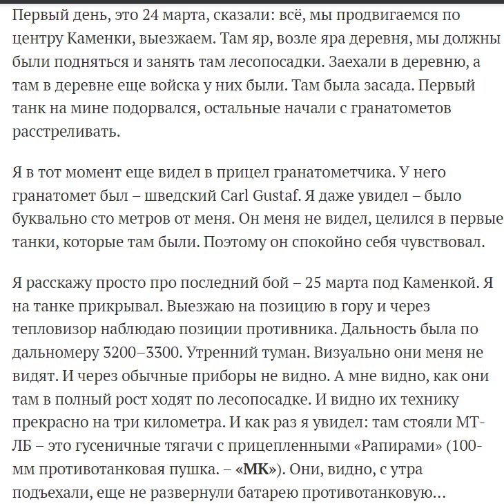 He said thermal optics are critical and that reactive armor on tanks was very effective. He said the thermal imager on his T-72B3 tank played a key role during a battle near Kamyanka on March 25 because he could see Ukrainian troops through a fog but they couldn't see him. 6/