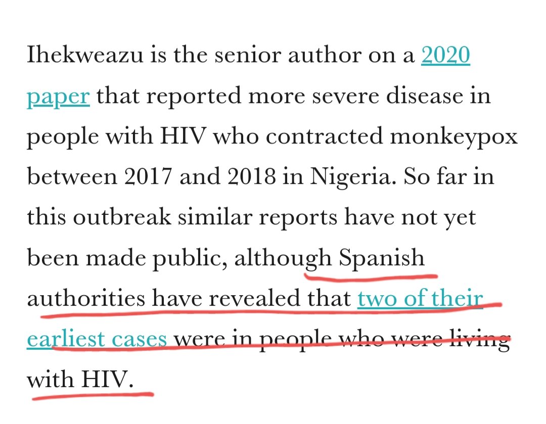 165/n Spanish Authorities have now revealed that the earliest 2 cases of #monkeypox that they had were in people with HIV , did that make the virus a little more fitter?? There is small changes BUT these small changes may allow the same ctd)