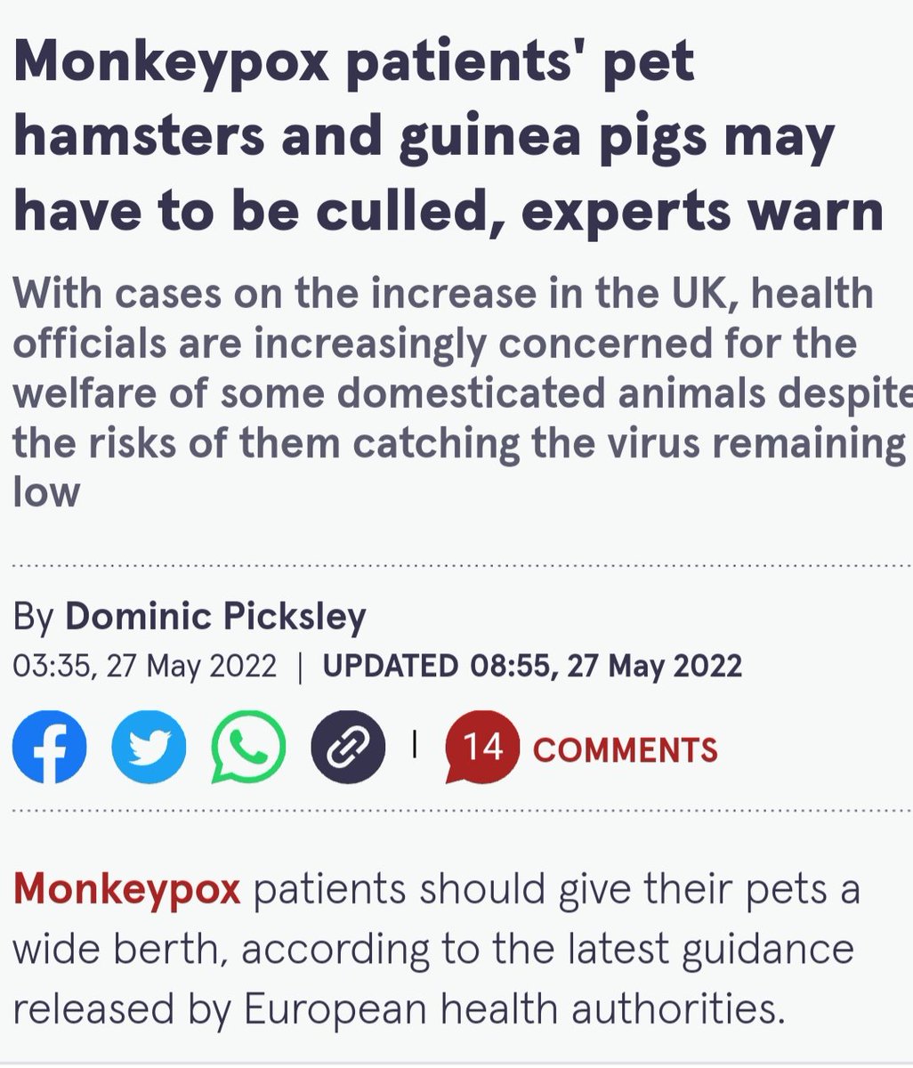 166/n the @DailyMirror UK reports that European experts are asking #monkeypox patients to stay away from pet rodents & also dogs / cats, fearing the virus may jump species , also talks of culling in extreme cases being discussed ctd)