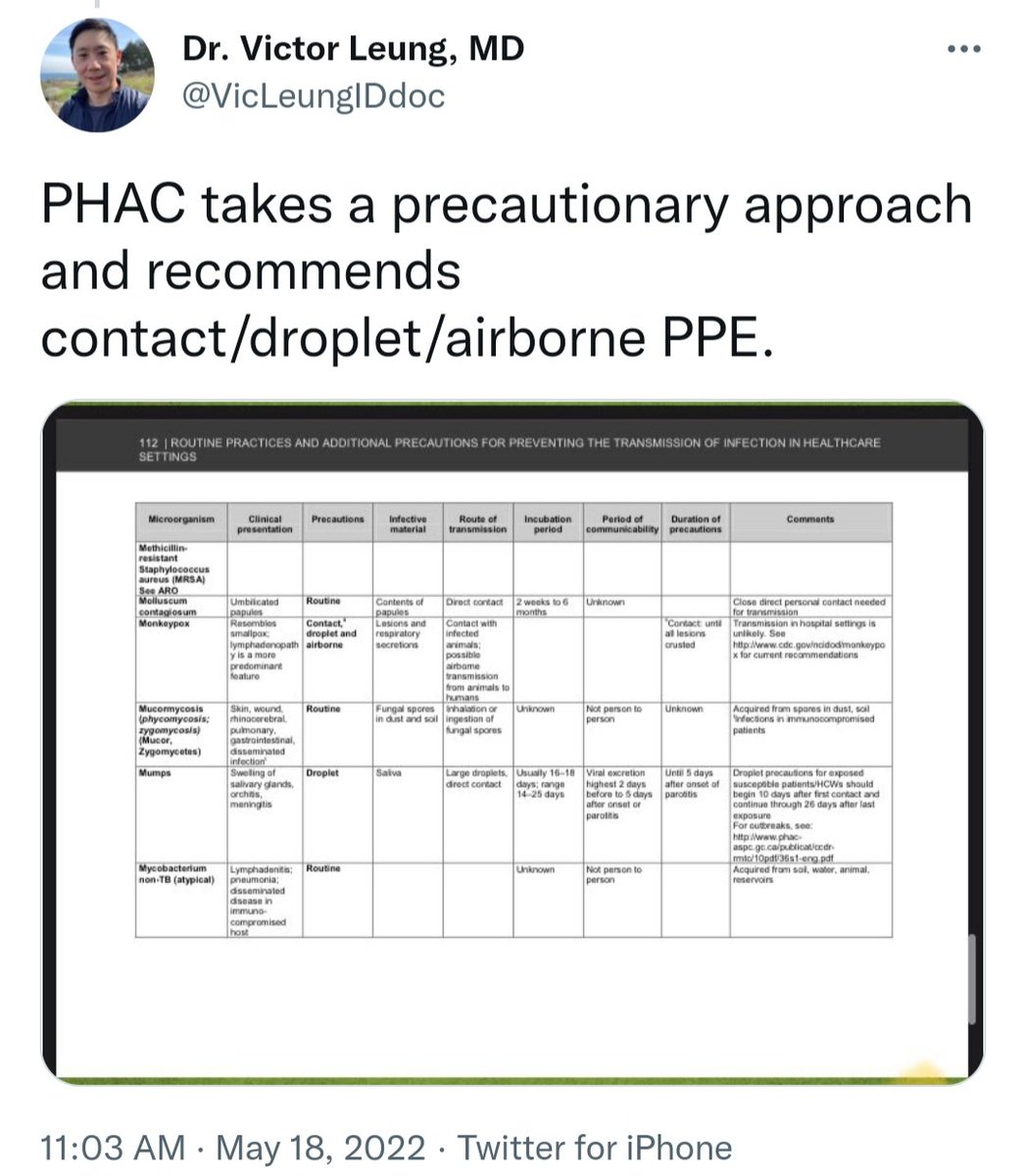 @DailyMirror 167/n @VicLeungIDdoc has kindly shared the Public Health Canada guidelines which accepts #airborne spread of the #monkeypox not falling into the just the contact & droplet dogma , fair game. 🙏❤ ctd)