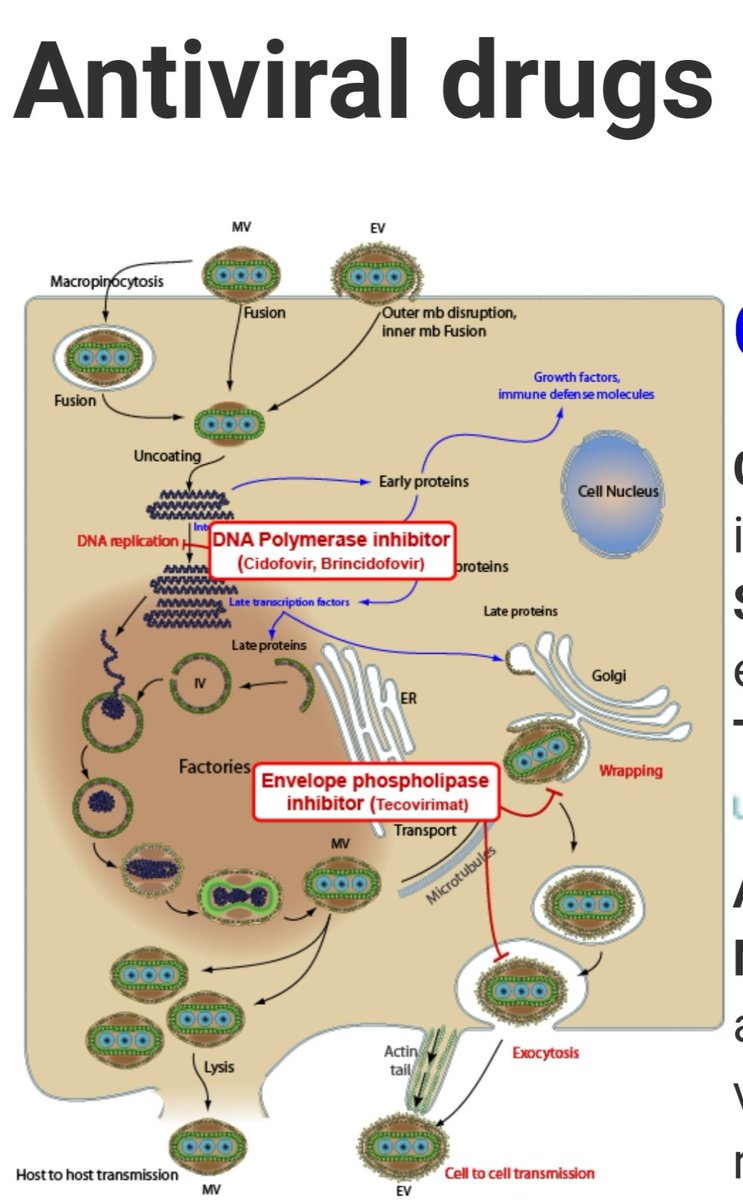 173/n A nice diagram to understand how #monkeypox enters cell and multiplies in the cytoplasm, where the drugs act to block the replication ctd) viralzone.expasy.org/9957