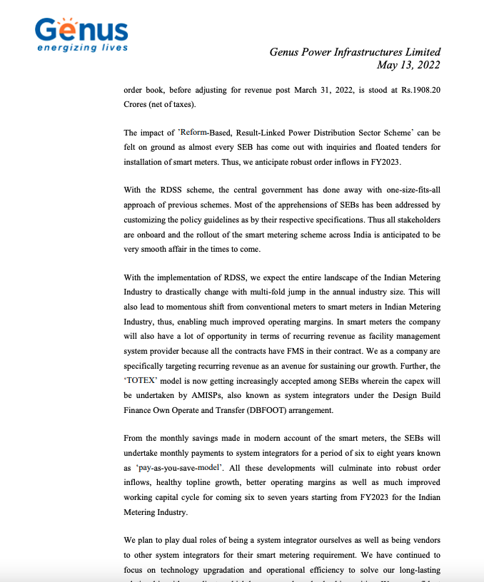 Government spend on smart meters is expected to go up exponentially in next few years (just check the concall of Genus power).