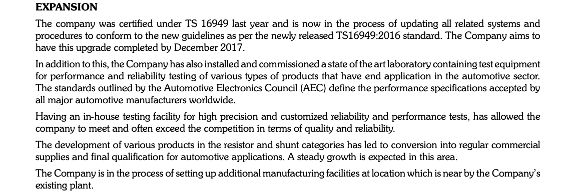 Shivalik has TS 16949 certification from FY17, generally taken for electronic components to be used in Automotive.