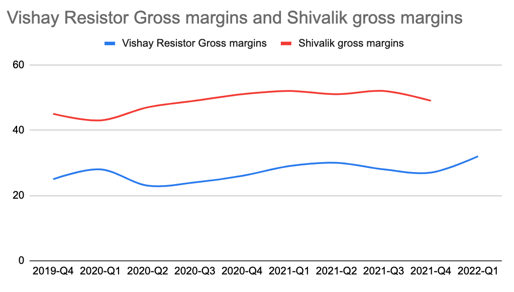 Another very interesting thing to observe is that while vishay resistor revenues dipped in 2021-Q3, Shivalik did not. This could show one of two things: