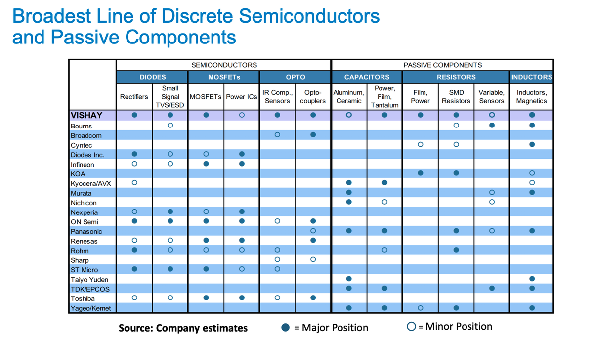 Just a glimpse from the investor presentation shows us that Vishay is the only one with a wide range of resistors (power, SMD resistors, Variable, Sensors)