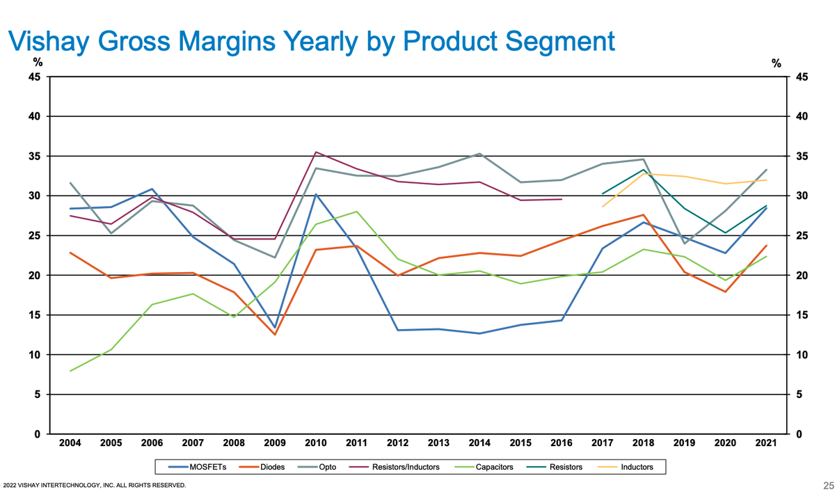 Generally electronic industry margins are influenced by supply cycles. Zooming out a little & looking at Vishay resistor (resistor + inductor pre 2017) gross margins over the years, we see that Vishay’s peak margins here have been around 35%in 2010.