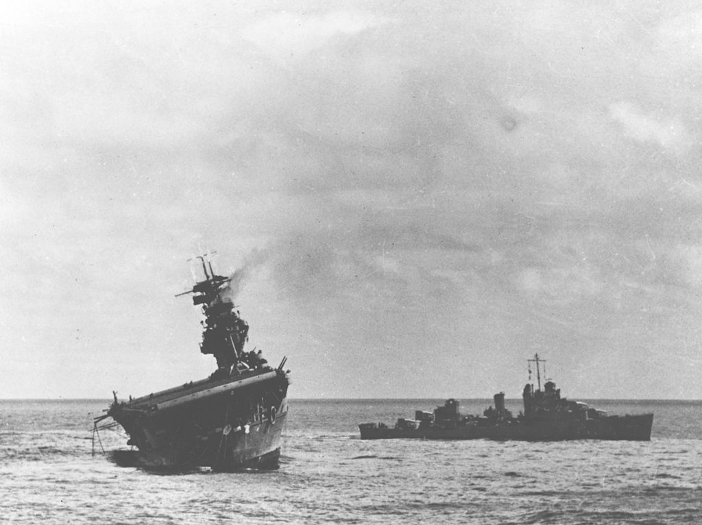 Fortement endommagé par deux avions torpilleurs japonais, le Yorktown fut abandonné pendant la bataille le 4 juin. Ses avions participèrent à la destruction du dernier porte avions japonais en décollant de l'Enterprise