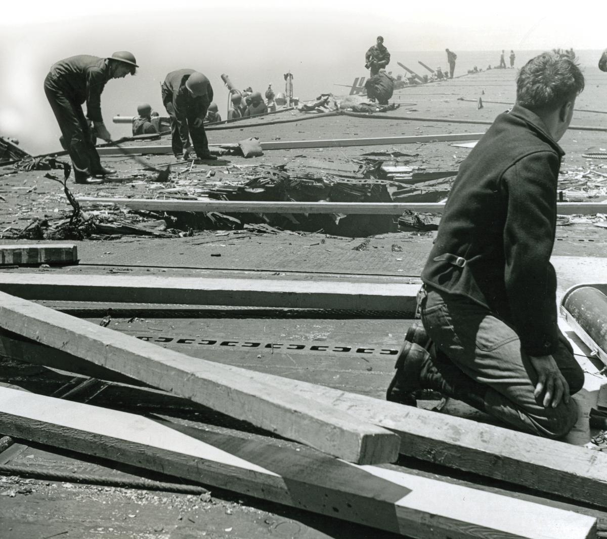 L’eau fut vidée du bassin et l’amiral Nimitz descendit inspecter le navire avec l’équipe de réparations.