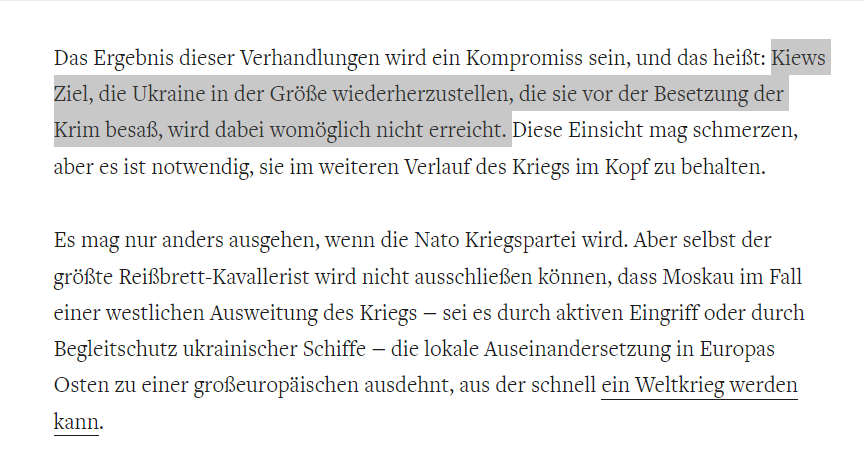 Kurzum: die "Welt" deutet an, dass Kiew und der Westen zumindest über die Abtretung der Krim nachdenken sollten.