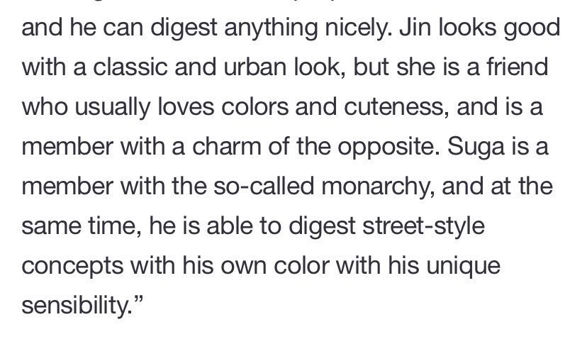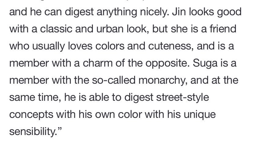 #SUGA He is a member with a so-called princely/monarchy beauty, and at the same time, he is able to digest street-style concepts with his own color with his unique sensibility.