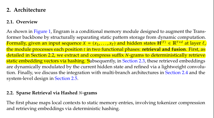 Engram is basically a giant memory table that gets queried using the last few tokens, so when the model sees a familiar short pattern it can fetch a stored vector quickly instead of rebuilding it through many layers.