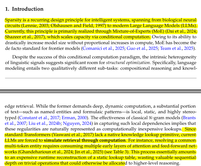 Mixture-of-Experts already saves compute by only running a few expert blocks per token, but it still forces the model to spend compute to recall static stuff like named entities and formula-style text.