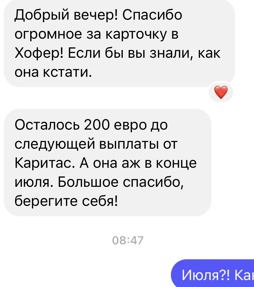 “Thanks so much for the Hofer card! If you only knew how much I needed it. I have only 200 Euros until the next payment from Caritas, that will only be the end of July!”