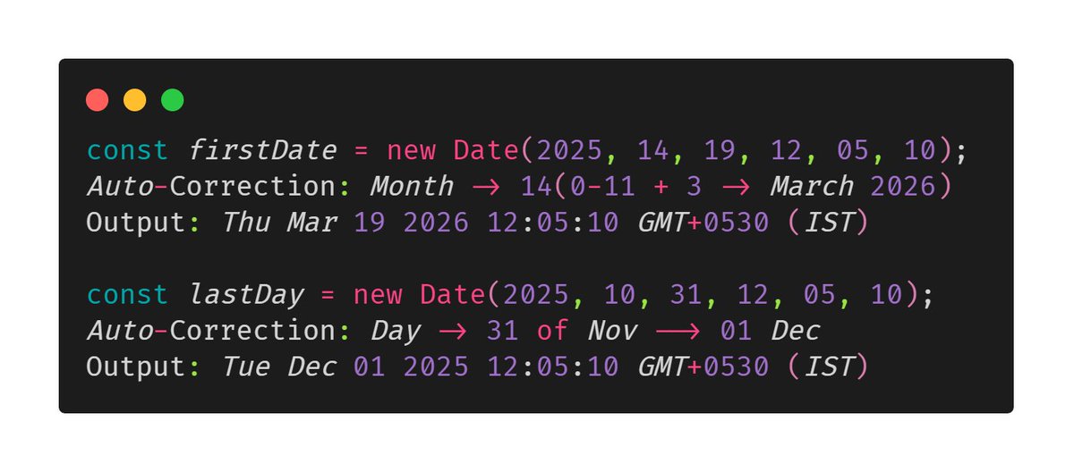 ✅Month is integer value ranging from 0 to 11. If a value greater than 11 is passed, year will be converted into next-year and month will be calculated from specified value like in example below. Similarly for date of month.