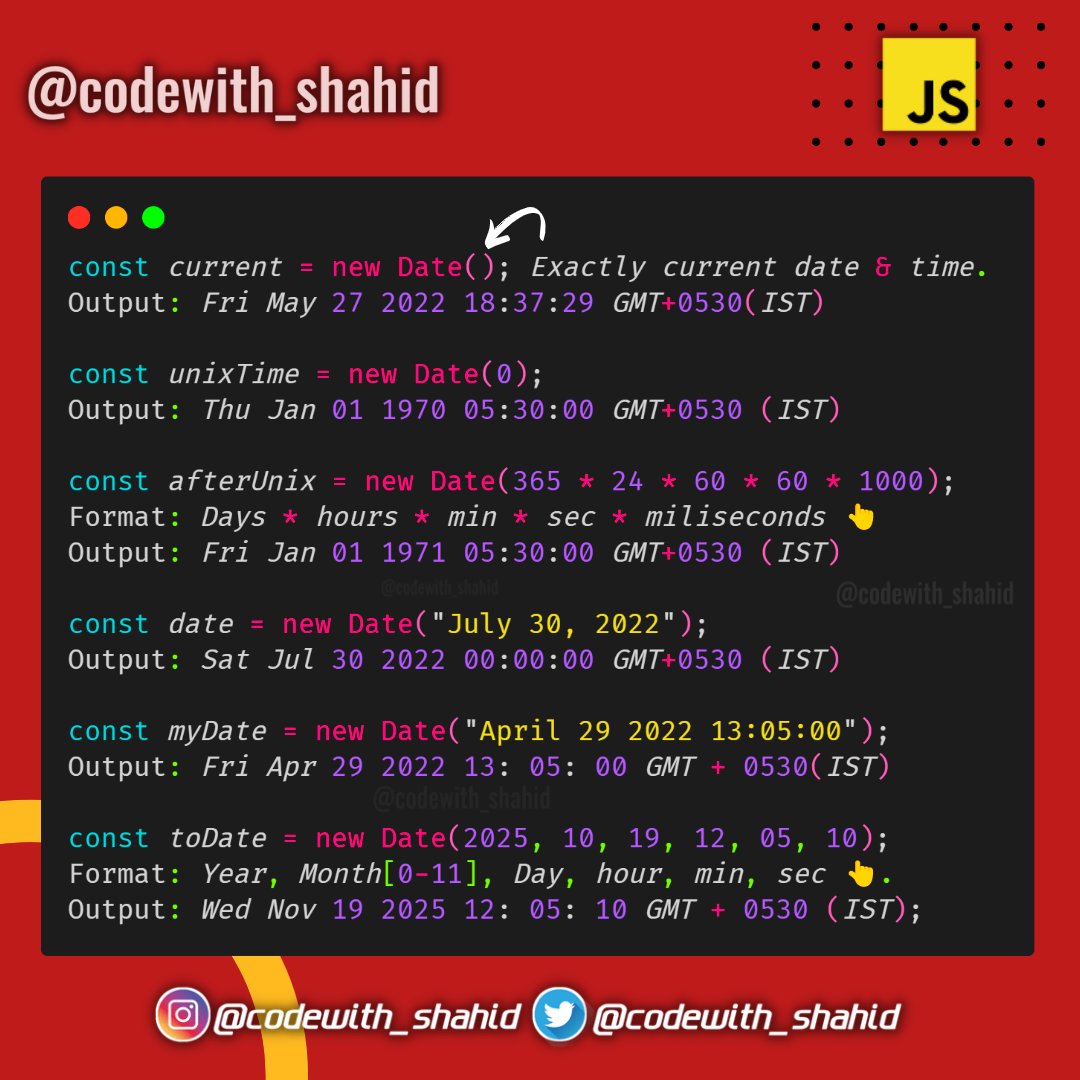 📌The Date object in JavaScript is used to represent a moment of time. This time value (known as UNIX-TIME) is since 1 January 1970 UTC(Coordinated Universal Time). We can create a date using the Date object by calling the new Date() constructor as shown in the below syntax.