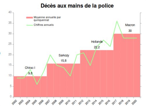 @FlagrantDeni 2. Résultat, d’après les décomptes du média en ligne Bastamag @bastamedia_ : avec environ 30 morts par an sous Macron, le nombre de décès de personnes aux mains de la police atteint un taux inégalé : presque deux fois plus que sous Sarkozy !