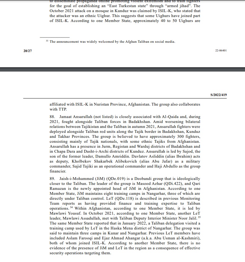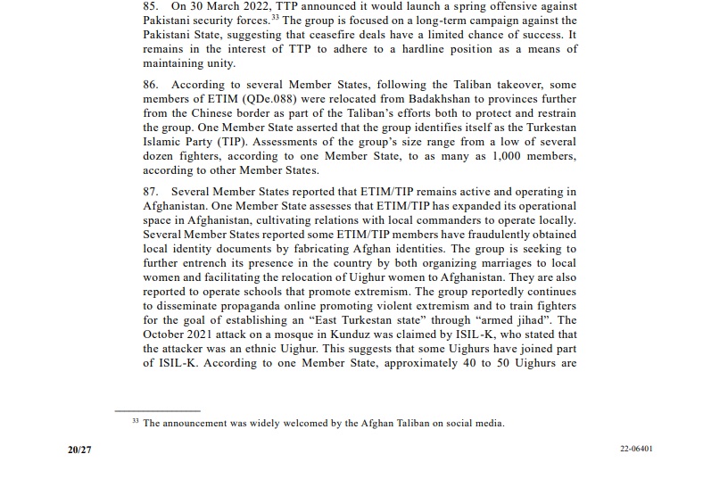"According to several Member States, following the Taliban takeover, some members of ETIM were relocated from Badakhshan to provinces further from the Chinese border as part of the Taliban’s efforts both to protect and restrain the group."