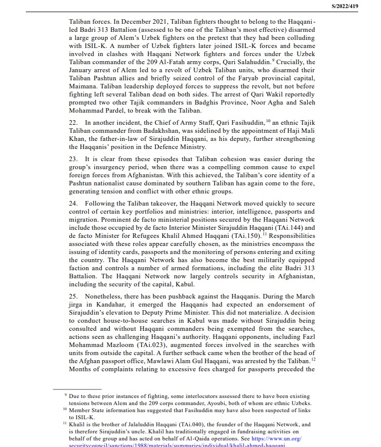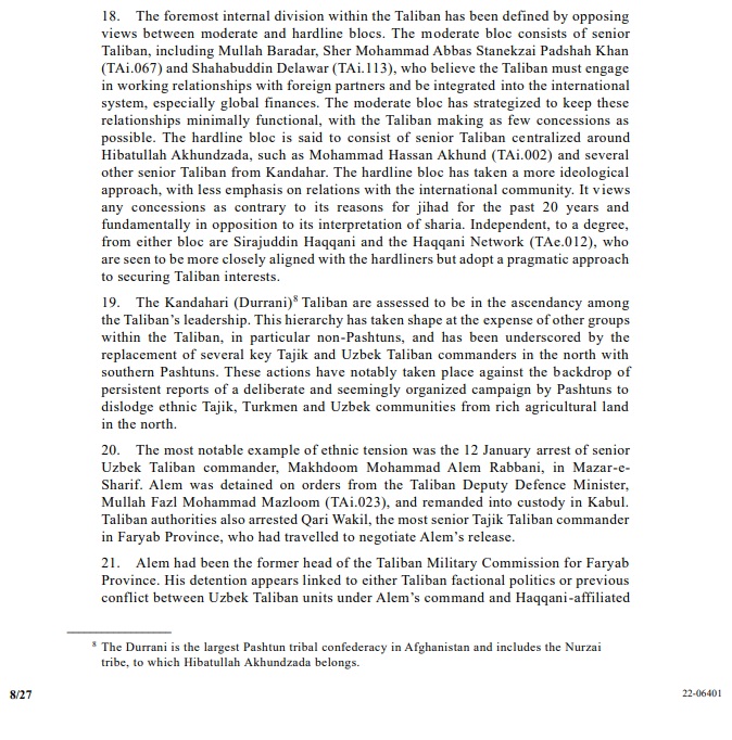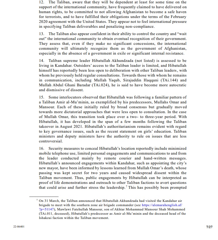 "Taliban supreme leader Hibatullah Akhundzada is assessed to be living in Kandahar..Towards those with whom he remains in communication, including Mullah Yaqub, Sirajuddin Haqqani and Mullah Abdul Ghani Baradar, he is said to have become more autocratic and dismissive of dissent"