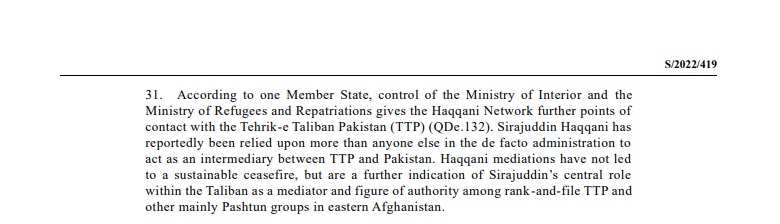 "...control of the MoI and the Ministry of Refugees and Repatriations gives the HQN further points of contact with the Tehrik-e Taliban Pakistan (TTP). Sirajuddin Haqqani has reportedly been relied upon more than anyone else...to act as an intermediary between TTP and Pakistan."