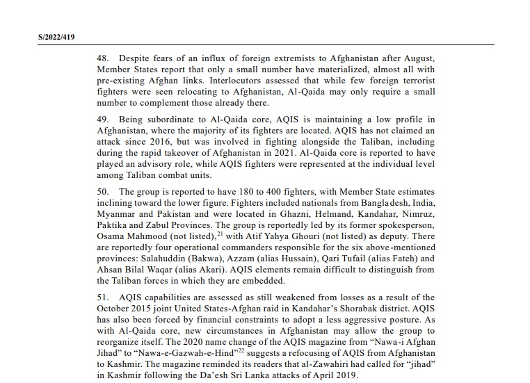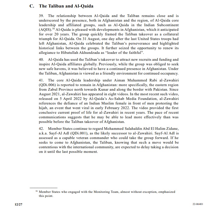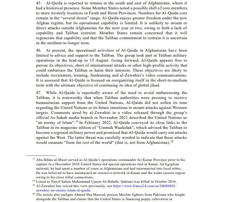 "The core Al-Qaida leadership under Aiman Muhammed Rabi al-Zawahiri is reported to remain in Afghanistan: more specifically, the eastern region from Zabul Province north towards Kunar & along the border with Pakistan. Since August 2021, al Zawahiri has appeared in eight videos."