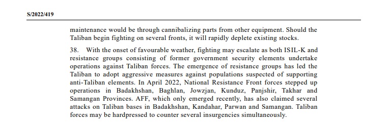 "The main military threats faced by the Taliban have been from ISIL-K and from former Afghan government elements in the National Resistance Front and Afghanistan Freedom Front (AFF), each of which is conducting guerrilla-style operations against Taliban forces"