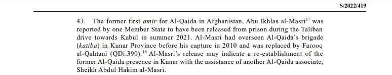 "The former first amir for Al-Qaida in Afghanistan, Abu Ikhlas al-Masri was reported by one Member State to have been released from prison during the Taliban drive towards Kabul in summer 2021."