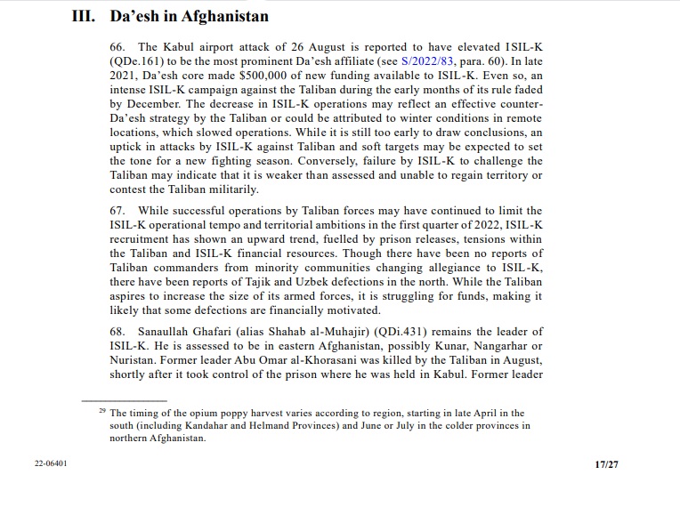 "The Kabul airport attack of 26 August is reported to have elevated ISIL-K to be the most prominent Da’esh affiliate. In late 2021, Da’esh core made $500,000 of new funding available to ISIL-K."