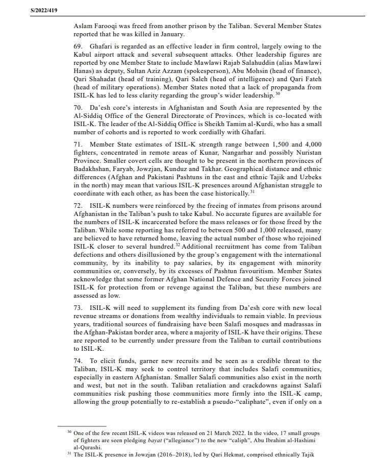 "Sanaullah Ghafari (alias Shahab al-Muhajir) remains the leader of ISIL-K. He is assessed to be in eastern Afghanistan, possibly Kunar, Nangarhar or Nuristan. Former leader Abu Omar al-Khorasani was killed by the Taliban in August"
