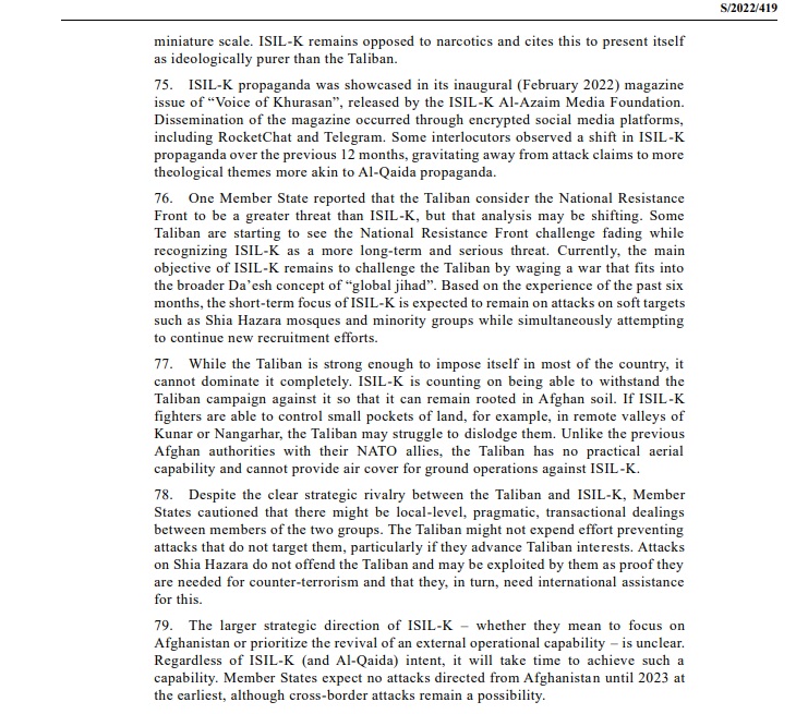 "ISIL-K propaganda was showcased in its inaugural (February 2022) magazine issue of “Voice of Khurasan”, released by the ISIL-K Al-Azaim Media Foundation. Dissemination of the magazine occurred through encrypted social media platforms, including RocketChat and Telegram."