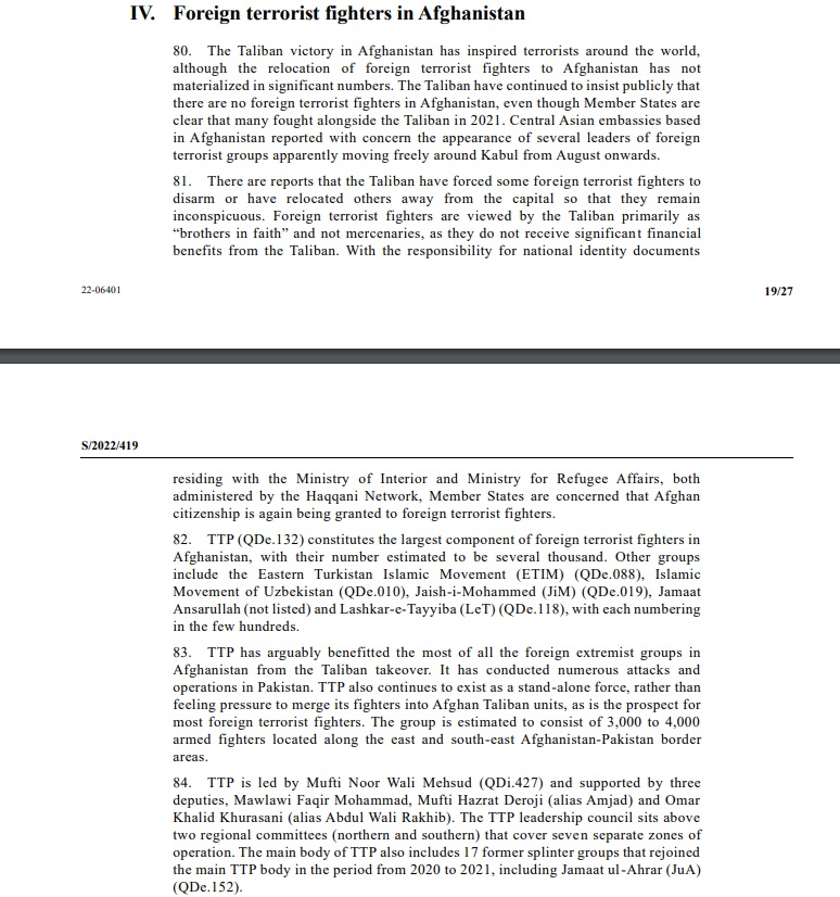 "There are reports that the Taliban have forced some foreign terrorist fighters to disarm or have relocated others away from the capital so that they remain inconspicuous. Foreign terrorist fighters are viewed by the Taliban primarily as “brothers in faith” and not mercenaries"