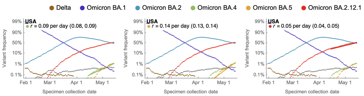 Previously, we could observe relative fitness based on frequency increase in South Africa of BA.4 and BA.5 and separately, relative fitness in the US of BA.2.12.1. But comparisons across geographies of frequency growth rate are not fully reliable. 4/12