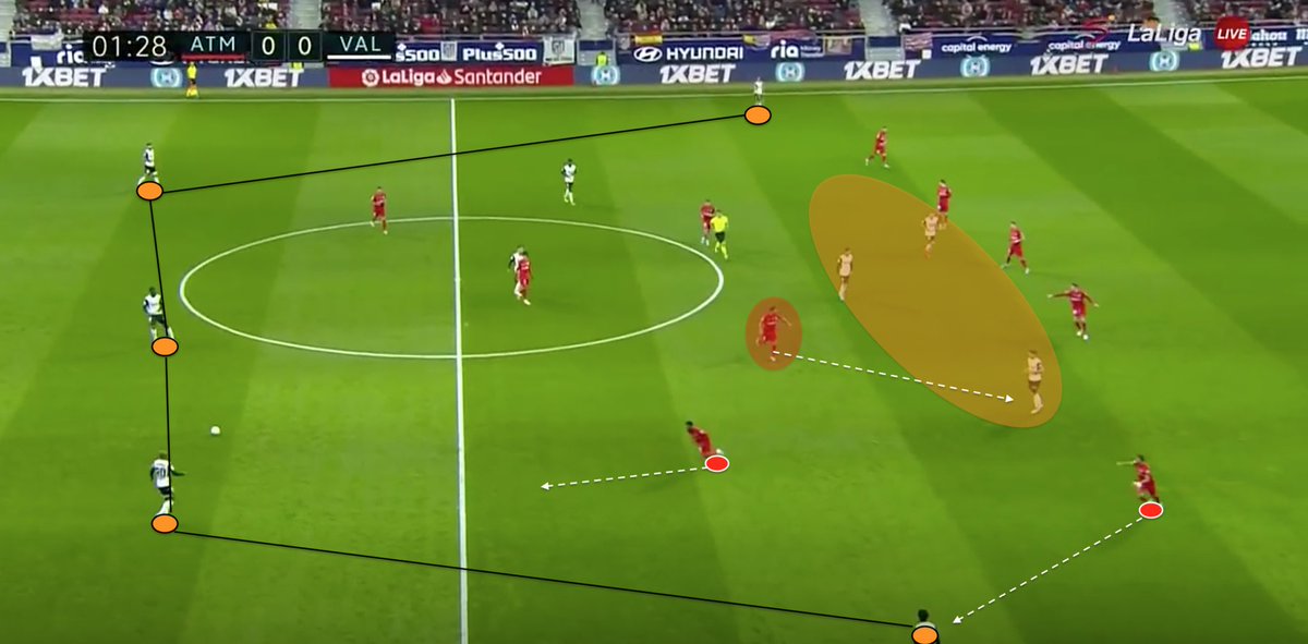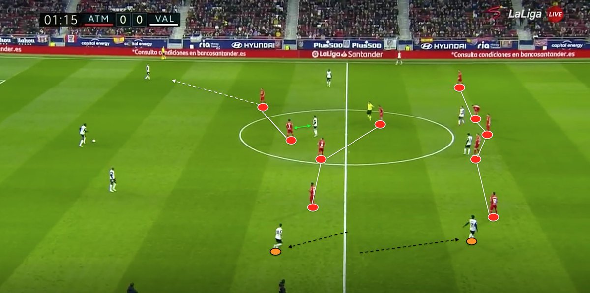 When Soler dives into the halfspace, it means Valencia centre backs initiate build-up through lanes. Atleti responded well by jump out with coordination, and Koke dropping off to cover space and man mark Soler.