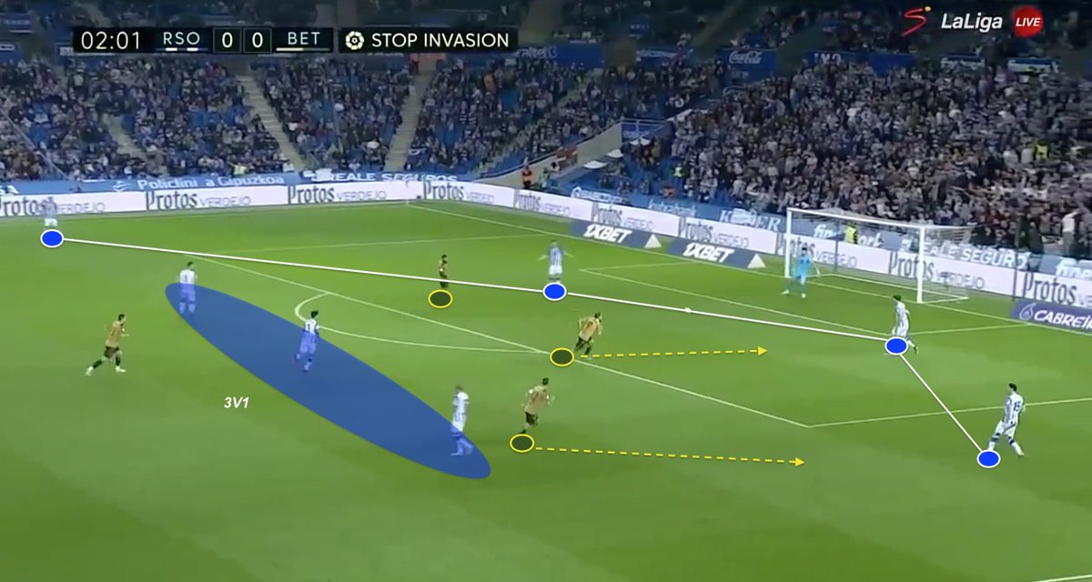 First objective from Alguacil was to draw in Betis first line of pressure, to end up with a 3v1 superiority and ensure build-up progression.